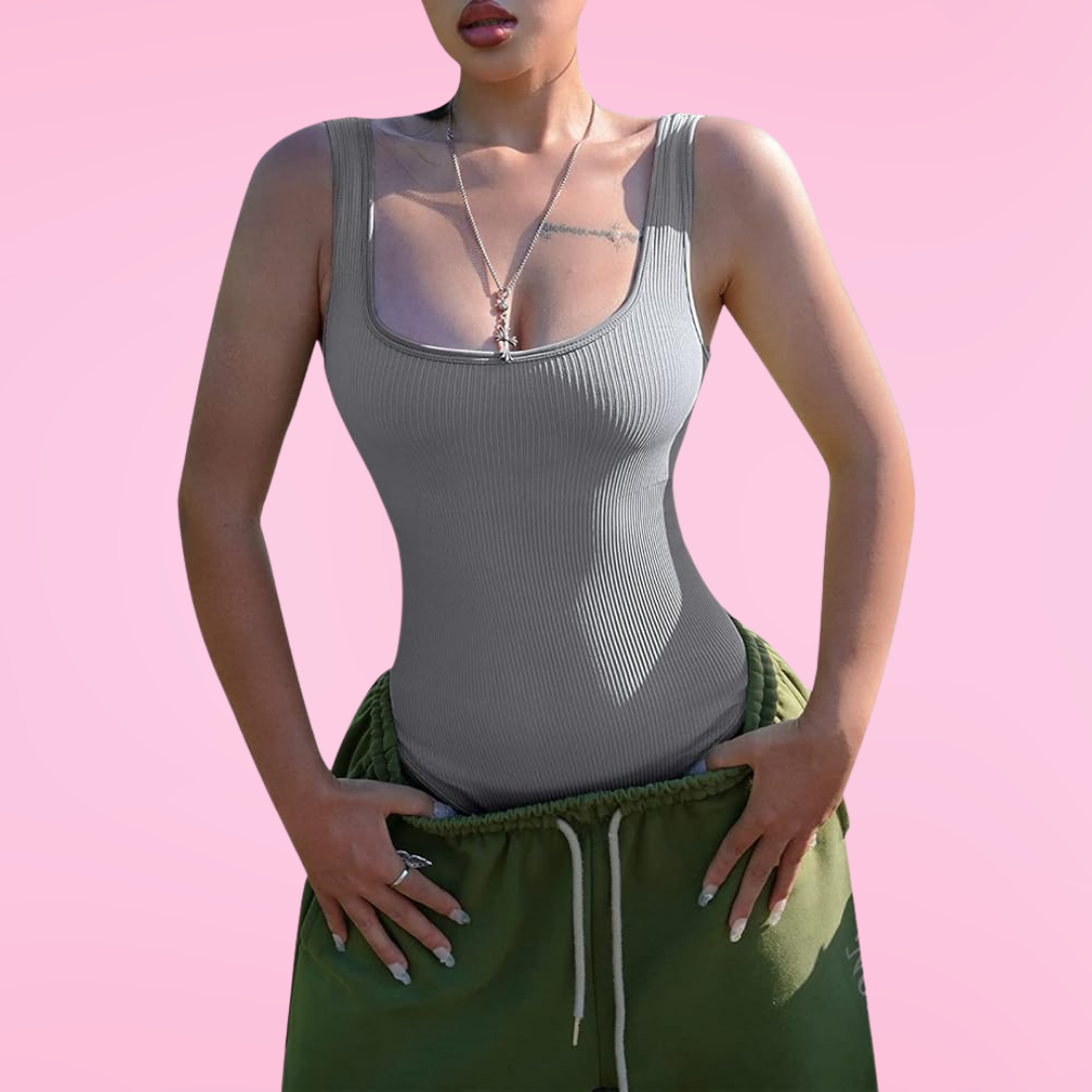 בגד גוף מחטב בסריגת ריב דגם נועם "נוחות של גופייה, לוק של דוגמנית."